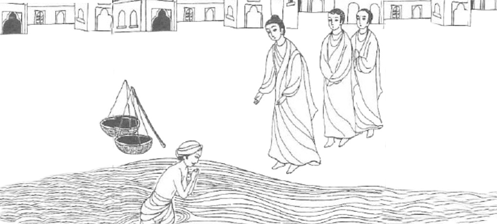 Suatu hari, Buddha bersama para muridnya pergi memohon makanan di sebuah desa di pinggiran Sungai Gangga, Buddha melihat seorang pria sedang memikul keranjang berisi kotoran manusia. Pria itu adalah Sunita dari kaum terbuang (paria). Sunita sudah pernah mendengar tentang Buddha dan komunitasnya, namun ini adalah pertama kali bertemu dengan Buddha. Sunita menjadi awas, menyadari bahwa dirinya kotor dan pakainnya berbau tidak sedap. Ia segera meletakkan keranjang itu dan mencari tempat untuk bersembunyi. Dari belakang berdiri beberapa biksu yang mengenakan jubah safron, dan dari depan Buddha sedang berjalan mendekatinya bersama dua biksu. Sunita tidak tahu harus berbuat apa, Sunita terpojok menuju pinggiran sungai dan bersimpuh lutut serta beranjali.