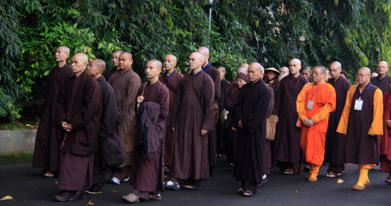 Keheningan sekitar lima menit seperti ritual, membumikan kaligrafi “Practice from the heart” yang melatari panggung, sebelum Thay—sapaan akrab Bhante Thich Nhat Hanh di Plum Village, yang artinya Guru, dalam bahasa Vietnam—memulai ceramahnya di depan sekitar 900 peserta retret di Caringin, Sukabumi, pekan lalu.