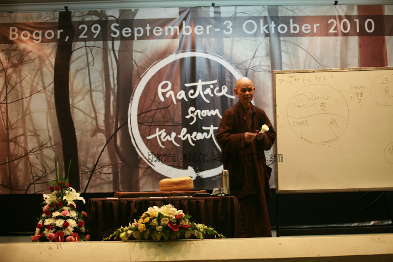 Ia berbicara tanpa teks, sambil duduk, kadang berdiri, berjalan perlahan ke papan tulis, menjelaskan istilah-istilah dalam psikologi Buddhisme dengan contoh-contoh sederhana dari kehidupan riel. Humornya subtil. Ketika lonceng kesadaran bergema, dia berhenti, kembali pada keheningan sepanjang tiga kali embusan napas.
