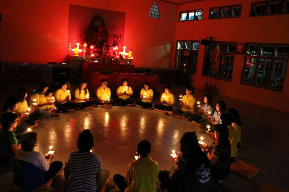 Satu orang sahabat bertugas menyalakan lilin pertama dari lilin di altar baktisala. Setelah lilin menyala, sahabat tersebut duduk sambil memperhatikan nyala lilin ditangannya bernapas masuk dan keluar dengan damai. Sahabat di sisi kanannya pun menyalakan lilin dengan mengarahkan lilin yang dipegangnya ke lilin sahabat yang sudah menyala. Demikian seterusnya hingga lilin yang dipegang seluruh sahabat menyala.