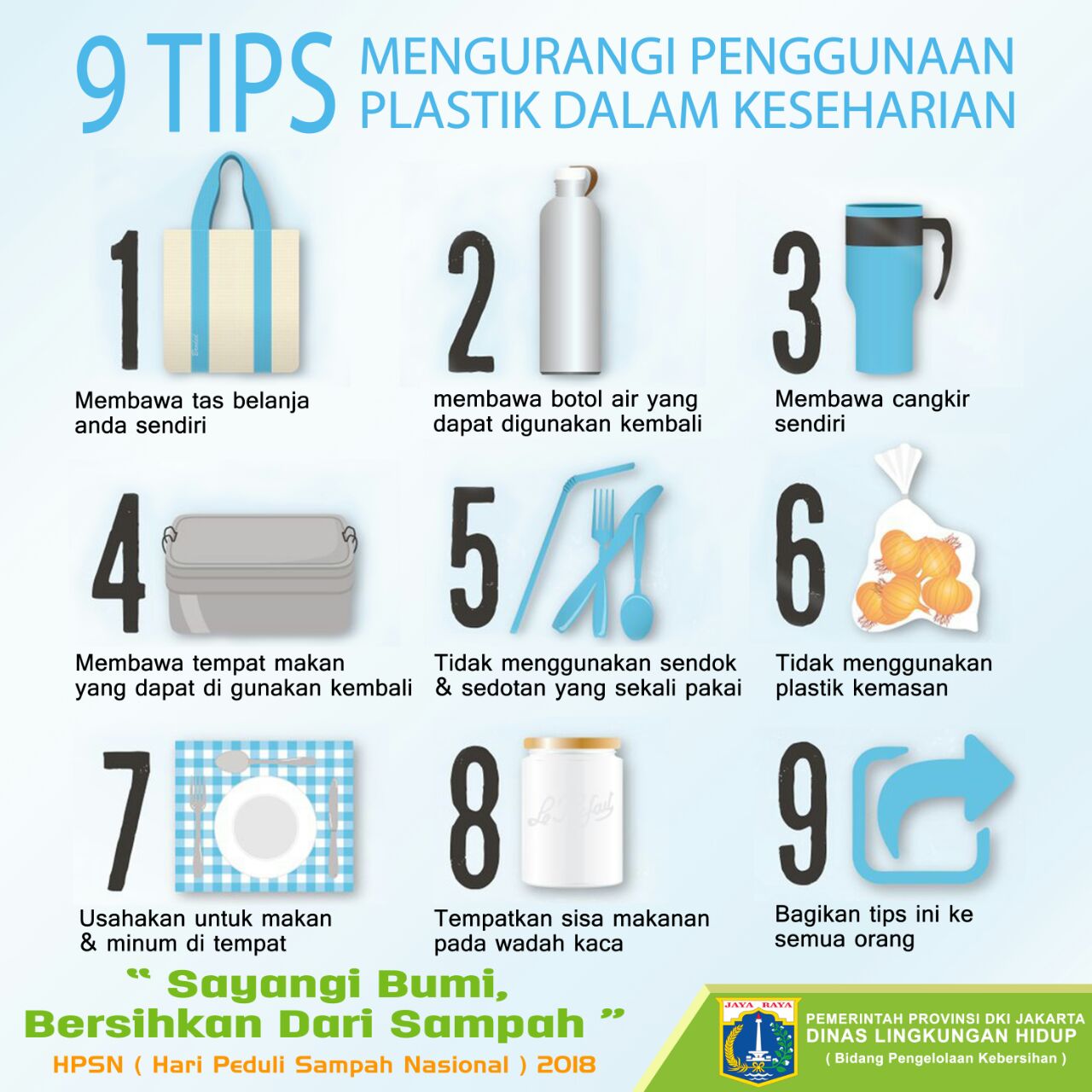 Pemerintah Provinsi DKI Jakarta, Bidang Pengelolaan Kebersihan 9 tips untuk mengurangi penggunaan plastik dalam keseharian, mari kita jadikan setiap hari menjadi hari peduli sampah nasional.