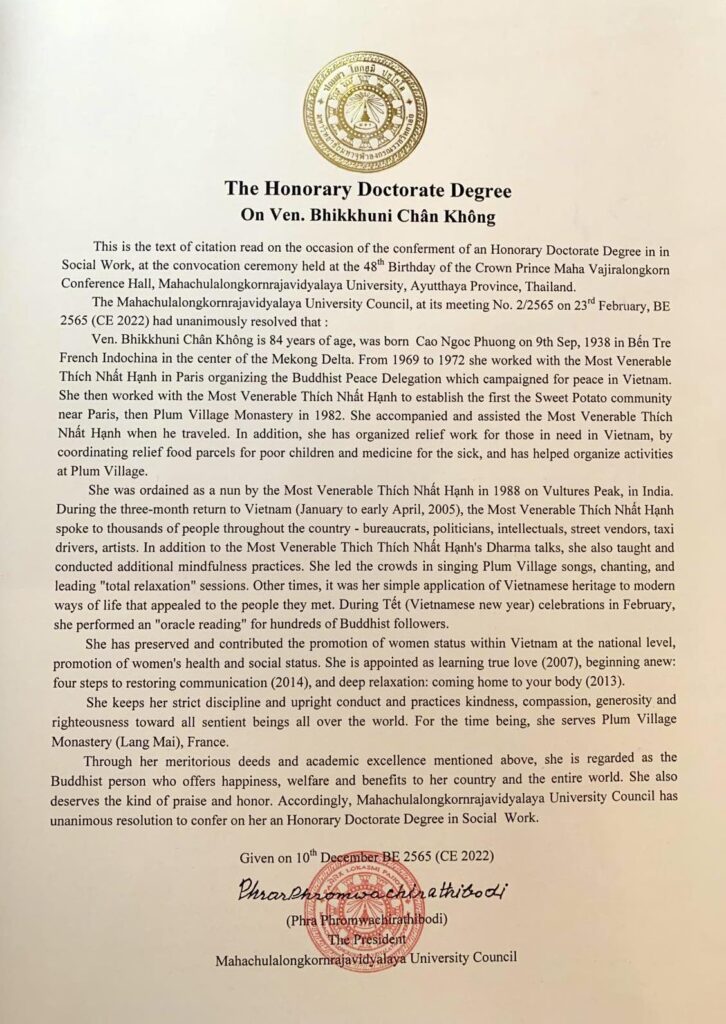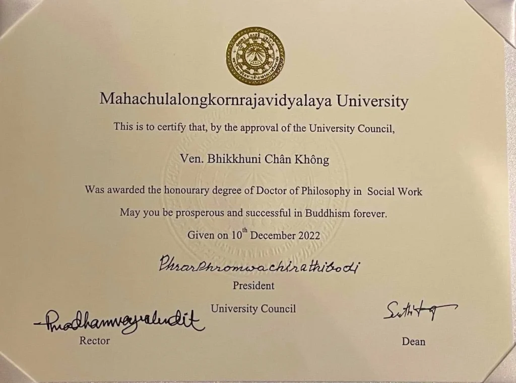 Biksuni Chan Khong, yang akrab disapa Sister Chan Khong, merupakan seorang aktivis perdamaian, murid dari Master Zen Thich Nhat Hanh menerima gelar Doktor Honoris Causa dari Universitas Mahachulalongkornrajavidyalaya pada tanggal 10 Desember 2022.
