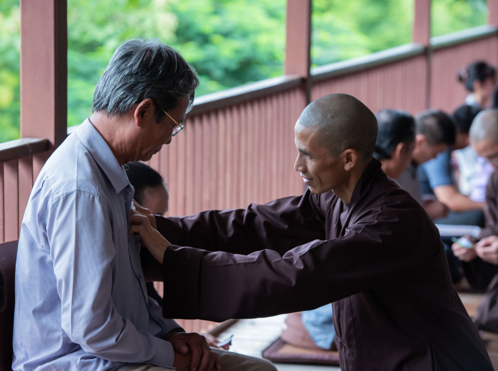 Selesai mendengarkan talkshow, acara dilanjutkan dengan seremoni memasangkan pin bunga mawar sebagai tanda menyatakan tekad untuk berbakti kepada orang tua. Beberapa monastik memasangkan pin satu per satu kepada semua peserta yang hadir.